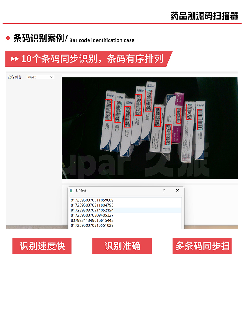 2、識讀范圍廣,能適配各種高度藥盒識讀,批量掃描藥品追溯碼,單次最大可掃描10-30盒藥品,掃描幀率達60幀;