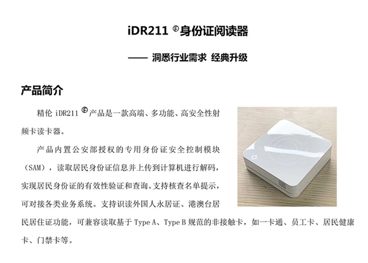 (*由于產(chǎn)品升級(jí)或其他原因,精倫IDR211身份證閱讀器產(chǎn)品實(shí)際參數(shù)有可能變更,以實(shí)際產(chǎn)品為準(zhǔn)。本文中的所有陳述、信息和建議也不構(gòu)成任何明示或暗示的擔(dān)保)